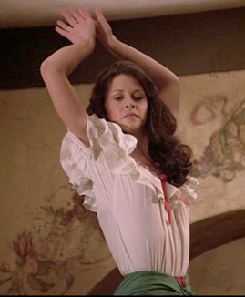 Grande Suitcase, But Uno Outfit? The next scene we see Petey driving an old jeep on the South American backroads with a brunette riding in the front seat. Wait, OMG that’s Jaime. With long brown hair!? I’m sorry, but this in not a blog devoted to the “Bionic Brunette,” so technically this review could end right now. But I have decided to keep riding along, because we have to help get poor Jaime out of this episode. And out of this pitiful dress—a wardrobe that Jaime immediately acknowledges is a “ridiculous outfit.” For the duration of this mission, she has to wear this same ruffled, off-the-shoulder white blouse and traditional spanish full length twirly skirt with black dancing shoes. Yes, dancing shoes, because her undercover occupation tonight is as Petey’s shady ex con girlfriend, a “Spanish dancer.” Whenever Jaime carries her purse basket with this outfit, I begin to suffer flashbacks of Little Red Riding Hood. Shrreeek! --->