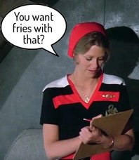 Hooray, tonight we get to fly the friendly skies of the Bionic Woman, where Jaime goes undercover as a 70s airline stewardess on a charter flight so she can body guard Dr. Rudy Wells. Of course, Oscar could have just assigned her to travel as a non-distinct, Air Marshally companion, but what's the fun in that, especially when you can dress her up like a fast food cashier from Jack in the Box?