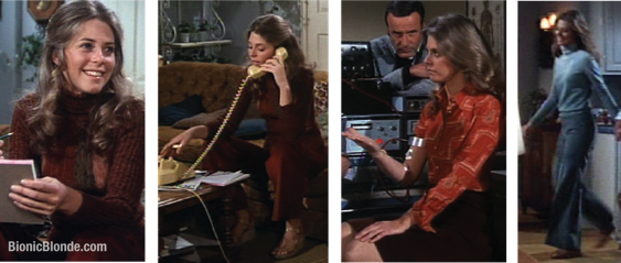 I counted 7 wardrobe changes on Jaime in The Bionic Woman (Part 2). She also wore this rust-colored turtleneck sweater in the horse riding montage seen in both episodes, and the red blouse at the lab was the same one Jaime had at the lake in part 1.