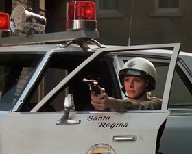 Hill Street Blues: Later it’s time for the ultimate stress test which apparently counts heavily towards their final grade. This involves police chasing a bad guy thru the back lot streets of “Consolidated Studios.” (Funny, I guess Universal was busy filming SMDM that day. *Blink. Blink.*) Anyway, the cadet’s performance gets filmed and they better hope they don’t flub, or it will probably wind up on American’s Funniest Home Videos.