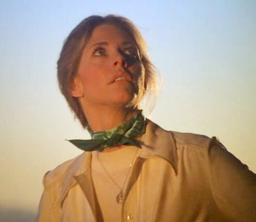 Jaime sported 3 outfits in the first half of Doomsday. In the opening kitchen scene, she wore bell- bottomed jeans with a blue plaid wraparound smock blouse tied at the waist. The next morning, a pair of bright red and blue flannel pajamas (pattern indeterminate), which I adored. And lastly, the two piece tan suit, which appeared to be a velour material. Later, she would remove this gorgeous green felt hat and blazer, to reveal a long sleeved white blouse over a (likely, sleeveless) white ribbed turtleneck, and of course, this signature teal green and blue neck scarf, that will make a surprise wardrobe return in next season’s Out Of Body.