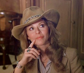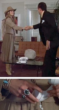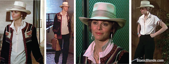 Jaime looked smashingly Dallas-corporate in her light brown calf-length skirt suit with beige leather boots & western hat. Jaime appeared to wear this same suit again in the final scene, too.