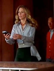 Samurai Sommers: Back in the hotel room, Jaime has changed again, this time into Exhibit F, a purple silk kimono robe, obviously just a temporary tie-over until wardrobe—who she has working overtime this week—finishes sewing her next outfit. (Or, maybe she had to attend a karate class between scenes?) Anyway, she and Quinn can’t find any spy chip in the designer outfit she stole. Meanwhile, some bad guy overhears them outside the door and discovers they are OSI agents.