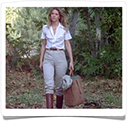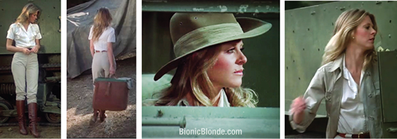 Form-fitting khakis with a white short sleeved blouse, leather boots with matching belt, a nice safari hat (I liked this one, too!) and for a brief moment later, we even got to see the matching jacket.