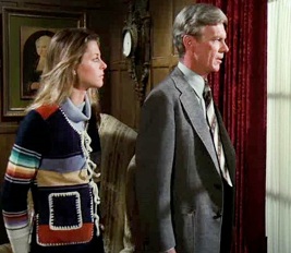 Just 3 wardrobe changes in this episode. For the beginning, a 2 piece tunic-style beige dress belted at the waist, worn with a knit shawl adorned with colorful macrame style tassels—which resurfaces in a scene in 3rd season’s Brain Wash. For her Germany scenes, she wore dark blue bell bottom slacks, and a Native American style horizontal striped sweater with white stitched pocket details and string ties. She may have worn this same light blue cowl neck pullover in The Martians Are Coming.