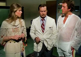 I'm Driving This Plot Now: This time Jaime gets to drive the Citroën DS 21. (Which I am purposely overpunctuating in order to justify my vehicle research.) The future Dr. Sommers apologizes to "Dr. Jones" for grabbing him back there, but she gets the sense he's a little shy and possibly a little lonely so she thought he could us a pity kiss. Smittenly, he agrees and blames his reclusiveness for neglecting his brother. When they reach Karp's estate, Jaime pulls over and gives Derwood a stern lecture about the dangers ahead and that she has to do this all by herself and oh by the way they are also planning to kill your brother. This "wall to wall stress" means you'll suck trying to use your biofeedback skills. Alas, Jaime is wasting her lines because Dimsquat's going with her anyway.