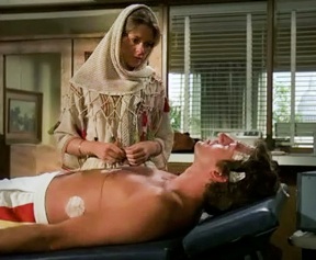 Dagwood, I mean Darwin (he's totally getting the Endora son-in-law treatment from me) wakes up to meet the angelic Jaime Sommers and asks if this is heaven. Okay actually he merely regains consciousness and Rudy yells at him hard for not warning him he was going into death mode. And then Jaime adds, "you scared the (ahem) out of me." I heart it when Miss Sommers lets her students fill in the 4-letter blanks.
