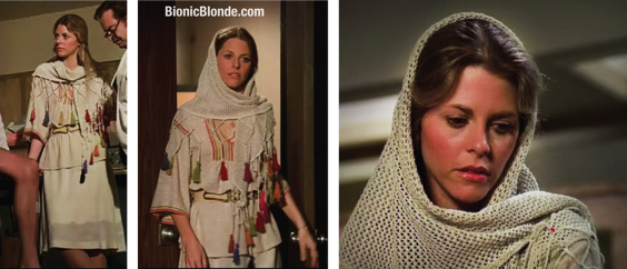 Biofeed Back The Clocks: The Bionic Woman was right on time tonight, bouncing by Rudy's lab in Washington wearing a lovely ecru tasseled knit shawl over her head, an item that will turn up again in 3rd season's Brain Wash.