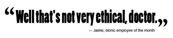 Woah, suddenly Derwood can feel an electromagnetic charge coming from like a loose wire on one of the machine thingys because he's ultra sensitive to that stuff now. Which of course means he can also sense Jaime's bionic arm when she politely shakes hands with him, causing Rudy to help quickly change the subject because it's none of Dermwit's OSI business.