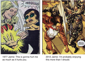 But this past year, I've been running into a lot of Bionic fans who are avid comic book collectors and readers (even some women), so I finally decided to see what I was missing, especially since there was a brand new Dynamite series being issued on the Bionic Woman with much excitement. Although this made me skittish—in an NBC foiled remake kind of way—that they would completely not *get* our Jaime Sommers. That she would bionic-smack people around simply because she could, using a lot of salty dialogue in order to compete with her more violent superhero counterparts. No touching scenes snuggling with kittens or spending an afternoon flipping through scrapbooks with Helen over a cup of Folger’s coffee.