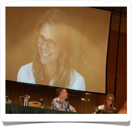 Then came Sunday’s big crossover event at 2:30 pm, with Lindsay and Lee together. This larger ballroom came equipped with some serious jumbo screens. The wizard behind the curtain even remembered to dim the lights this time, so people in the audience could actually see the video, too.