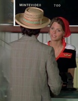 Miss Winters appears to be on uppers, gleefully checking in Rudy's baggage and speedily filling out his passenger ticket for a special Charter flight to Rio where he will relay the formula to Oscar. Jaime has already memorized the customer service employee manual in both Spanish and English, and slogans to Rudy: "We really MOVEMOS our CADA for you, señior!" Loosely translated, Jaime just promised her airline will move their bionic asses for their customers. I think.