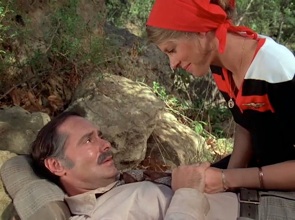 Just then Romero arrives, so Jaime sends him back to camp to get the Swiss Miss-ion nurse, unaware that she's the bad guys' ringleader Bobby. The nurse is fed up with this go-go booted stewardess interfering with their plans to get Rudy, and vows she will take care of Jaime herself. Noooooo!