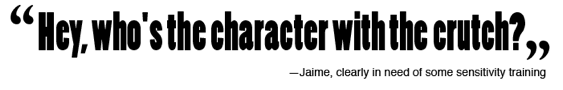 Raising the Bar: The poor ‘character with the crutch’ turns out to be Duke, whereupon Jaime starts pumping him for information about the ship’s hull opening because she's become a collector and stuff. To deflect her questions, he asks her "why don't you become a drinker?" A-haha!