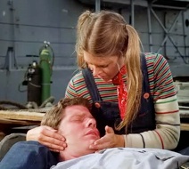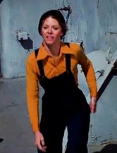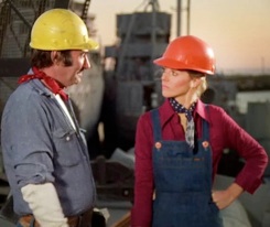 Ship, I’m Late For Work: For her second day on the job, Jaime's wearing the same blue jean overalls and a striped pullover underneath plus a red bandanna. Having been tampered by the bad guys, a steel cable holding a heavy pallet from a crane above forthwith breaks—intended to fall on Jaime to get rid of her— but Bobby pushes her out of the way at the last second and gets pinned under it himself.