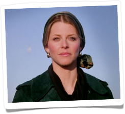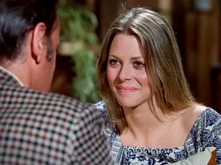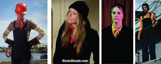 For her shipyard duties gig, Jaime wore flared, blue jean overalls with straps that crossed in the back. Paired with a long sleeved, maroon blouse and blue bandanna neck scarf, a multi-striped knit pullover and red bandanna, and finally a gold, long-sleeved blouse. Sorry I was not crazy about her spot-me-from-the-space-station orange hard hat and would have preferred she switch and wear Bobby’s blue hard hat, instead.