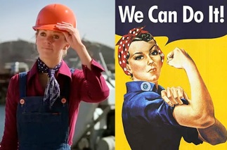 I love how Jaime is semi-dressed in homage to Rosie the Riveter for her first day on the blue collar job. Blue jean overalls worn with a burgundy blouse, a blue bandanna scarf and no. This neon ORANGE hard hat? Jaime, could we not find something that complemented your outfit any better?