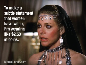 Network smoke-filled room of men: Hey let's contrive a mission where the Bionic Woman must submit to men as a concubine, but place it in a culture where this is permissible therefore we can enjoy this sexual fantasy without recrimination. Excuse me, but bullsh*t. And I've never used that word in my blog before so you KNOW they blew a gasket on the Bionic Blonde's Meter of Forgiveness.