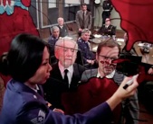 Now Hear This: From the control room, Franklin has spotted an intruder on the security monitor and grabs the mic for Kill Oscar Karoke Night! Actually, he calls out to Miss Sommers on the loudspeakers, and orders her to surrender or he really will Kill Oscar this time because he's standing right here.