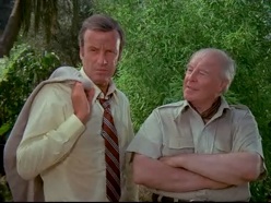 As Jaime recollects Steve's echo-voiced plan to head for the dam if they get separated, Franklin becomes furious and has Katy re-calibrate the weather machine dial in order to force Jaime back, even though it will bring hurricane winds onto the island. Suddenly a gust blows up and totally messes up Jaime's hair. She starts bionic running through the jungle, but WATCH OUT FOR THAT FALLING TREE, and gets knocked to the ground. Franklin orders Fembot number 006 to go get her. Oh no, Jaime's lying there unconscious, so of course it's time for a commercial so we can worry incessantly about her while we pour another martini. Mood ring: Black.