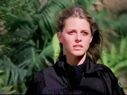 Jaime's barely had time to survey the beach before suddenly from out of nowhere, we see a helicopter trying to chase her down, being piloted by a faceless, sport-helmeted Fembot. Jaime retreats to a jungle area and strips off the rest of her wetsuit—back down to her mauve outfit from earlier.