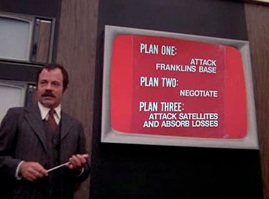 <-- Really the scene is pretty much over for me after this from laughing so hard, and I promise I didn't touch this… it's an honest-to-goodness, 100% pure screen grab from DVD. As you can see, Plan 1 and Plan 3 involve ATTACK, while the #2, peaceful approach gets immediately shot down by everyone in the room. No pun intended.
