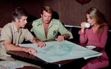 Jaime has changed into a mildly appealing, 2-piece matching mauve slacks and top ensemble, but I mean she IS on a submarine, so it's not like she would be packing attire for cocktail parties. This is perfect for her to casually sip tea while Steve and Commander Gordon pore over a map of the island they're about to invade.