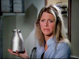 Following an episode of restful acting, Jaime appears to be recovered now because she's sitting atop her bed in a light blue dress repeatedly brushing her hair for that healthy Breck conditioner shine. 87, 88, 89… Steve's lounging in a chair next to her reading the paper while they watch TV.