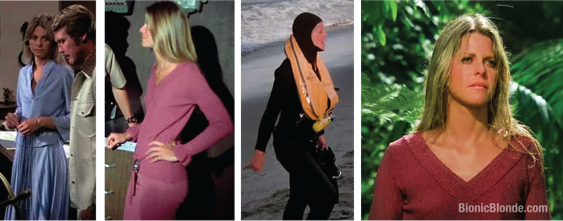 Just four outfits in a wardrobe episode theme of basic solids. In the first few scenes, Jaime wore a v-neck, long-sleeved blue dress with a pleated skirt, belted at the waist. On the submarine and island, a casual-coordinate: mauve-colored, long sleeved top with bell bottom slacks. A solid black scuba wetsuit, and finally the iconic Fembot costume: A black, bell-bottomed jumpsuit with long, matching gloves, ascot/neck scarf, helmet and black tennis shoes.