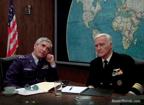 One of the generals at the conference table immediately complains, "Does the young lady have clearance to be in this room?" EXCUUUUUSE ME?! And incidentally I am completely distracted by that pair of ultra-groovy turquoise blue sunglasses this general has stationed on the table in front of him. (Pretty sure he's in the ‘Don't Ask, Don't Tell’ program, too.)