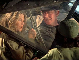 And then (whistle fishing theme) Andy Griffith as Sheriff 'Jack Starky' Taylor arrives to pick her up, a crusty old helicopter pilot who doesn't think this war zone is any place for a woman. Jaime seems a bit caught off-guard by his sexist attitude at first, but manages to refrain from comment. And then Oscar kisses her goodbye on the cheek and tells her to be careful. Starky witnesses this and reacts with disgust, "I don't believe this!"