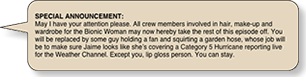 Breaking News: With footage of hurricanes and floods rolling, real ABC news anchorman at the time, Howard K. Smith, reports they are unable to offer an explanation from the National Weather Service on why all this extreme weather is happening in the southeast. And then it cracks me up that he announces ABC has also attempted to reach Oscar Goldman of the OSI for comment. Because my weather alert radio is always tuned in to the OSI Accu-Weather channel, where I rely on code name Snow White to tell me if it's going to be cloudy with a chance of cyborgs today.
