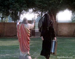 Anyhoo, the wrinkly Reverend Mother tells Jaime she's seen her miraculous gifts God has given her, and prays she will always use them wisely. Jaime vows "I try to. I really do." She God blesses and they say goodbye and Jaime picks up her suitcase and heads across the courtyard for home. Sigh. Don't you just love spiritually happy endings?