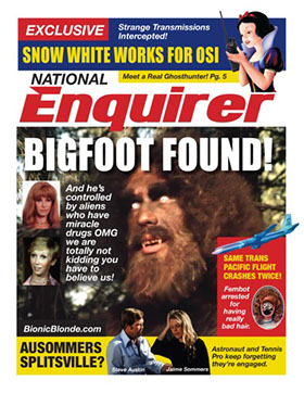 Suddenly Gill-alien materializes using a stolen Beam Me Up Scotty® remote and tells Jaime to take her hand quickly, and boom, they disappear. A second later they reemerge in a dark cave and Jaime's like hey this is happening too fast and who the hell are you anyway, and OMFG I just got in a fight with the urban-legendary, mother-effin’ Bigfoot do you happen to have a lint brush on you I could borrow? And also a camera? Because this could TOTALLY get me on Oprah.