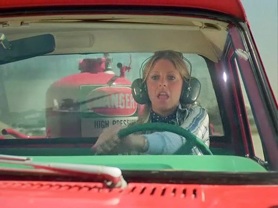 Blaze of Glory: Laurie points the Bionic Woman in the direction of the Fire Truck Garage. Jaime, you kinda look silly in these HUGE headphones so I hope you at least have some Led Zepplin cued up on your iPod right now to make it all worthwhile. Jaime finds the fire truck with the DANGER HIGH PRESSURE CO2 labeled tanks loaded on the back and jumps in the driver's seat of truck, but forgets to put on a fire hat and sound the siren. (I’m deducting 50 points from her score for this.)