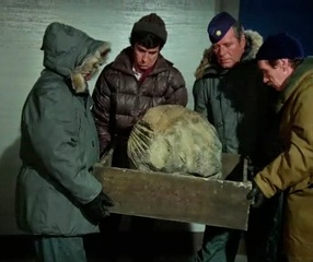 STONEHENGE: The next morning, Jaime and Laurie are back at the air base of howling wind, hiding behind a stack of barrels. Shush, Jaime is thinking and trying to figure out how to take this rock down. But first I think we should have another science plot review on how the rock thrives on heat and that's why all its rolling stone groupies are dressed so warm because just like the mother meteor, they fear the cold temps will kill them.