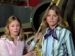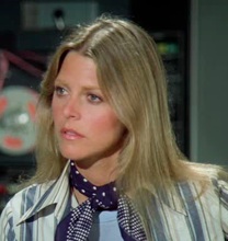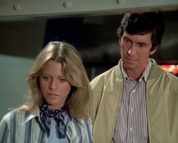 Just one outfit in this episode. (I’m beginning to go thru wardrobe withdrawals.) Bell bottom blue jeans with double zip front pockets, with a light blue pullover shirt worn with a long sleeved blue striped blouse; rolled up sleeves and tied at the waist. (This looks like the same blouse she wore during the opening scene in Assault on the Princess). Jaime also wore white tennis shoes and a dark blue bandanna/neck scarf.