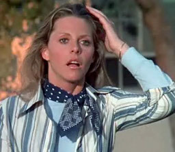 Jaime rallies the strength to get to the passenger seat after all, and I love this "you little b*tch" face she shoots the defiant teen, right before Laurie lays down the gas pedal and they race outta there. You are totally grounded young lady. No texting for a week.