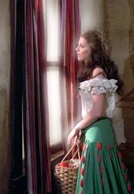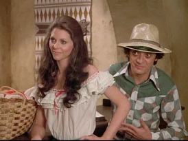 Now about this Spanish dance outfit with green skirt and white ruffled blouse... while a bit over the top, in retrospect it is actually kind of cute, plus this is the only episode in the series where the Bionic Woman got to skip the dizzy blonde wig to became a brunette. And yeah, in a balcony jump they totally did film her skirt flying up to reveal red panties—which makes this the first and last time lingerie was ever introduced in her wardrobe.