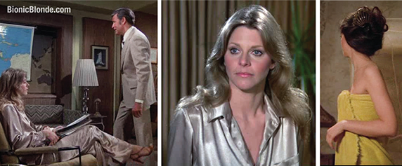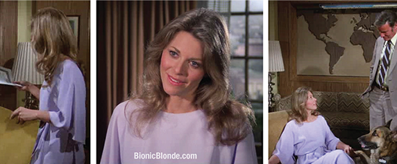 Meeting in Oscar’s office, she had on a lovely, oversized grayish mauve silk blouse with matching baggy slacks. But you can’t fool me, Jaime Sommers. These were your Jammies™, and you were letting us all know in your subliminal way, that what we were about to see was not real. Let the dream sequence commence....