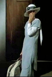 Her arrival in Paris outfit was my fave. A 2-piece blue, short-sleeved tunic-style suit, worn with a candy pin-striped blouse with necktie collar. And a stylishly white dress hat with black band and striped side detail that matched her blouse.