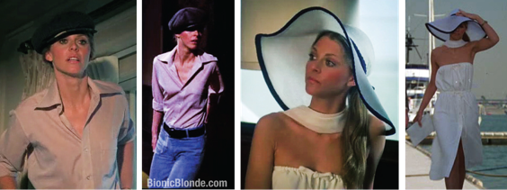 During their night at the museum caper, Jaime changed into Pierre’s bell bottom blue jeans, pale pink long sleeve shirt and a beret. The following day for their scenes on the yacht in Cannes, Jaime wore the striking, one-piece white strapless sundress. Accessorized with a white scarf and an oversized white sun hat with dark blue trim.