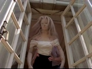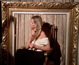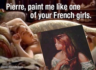 Well at least Shamey finally gets to change out of this French courtesan costume and into a rather nice, formal silk, puffy, off-the-sleeve blouse with a long black skirt for her new role as a “upscale peasant model too poor to have a lady’s maid to comb her hair for her.” I am sure her bionic arm automatically went into sleep mode followed by a cute kitten screen saver after holding that comb for several hours without moving while Pierre finished the painting. (BTW extra points for this cool shot where the director Barry Crane framed Jaime in a mirror just like the painting.)