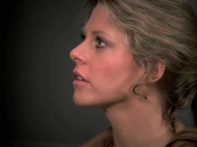 And then after Jaime hangs up she hysterically can't get the phone booth door open so she bionic breaks it and then leans it back in place and looks around all embarrassed to see if anybody saw her. Mood Ring: Purple. I heart this scene because it harkens back to her initial bionic rejection episode where she similarly destroyed a phone booth door. It now appears the Bionic Woman has become the anti-Superman, and it's a darn good thing she doesn't have to regularly change into a cape.