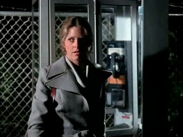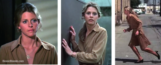 Follow That Car: Jaime takes off after them and amazingly manages to tail them throughout the big city and all the way to the Arthur Hatch Research complex—in heels and safely undetected as the Bionic Woman racing down the highway. She catapults over the tall security fence to follow them inside (incredibly in a dress without her skirt even flying up—an anti-gravity skill only Jaime has mastered)—just as two NSB feds pull up and recognize her from her Hollywood promo photo, and call in her sighting to the boss. Oops.