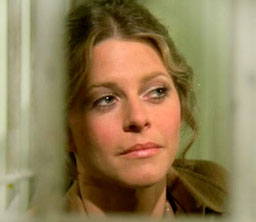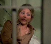 Hunger Strike: Jaime fake-complains to the guard she's starving but he says they don't have a mess hall. "But isn't there some kind of machine upstairs that sells sandwiches or candy or a CUP OF COFFEE WOULD BE NICE, please?" (And yeah see if you can make that something from Starbuck's hot new "Blonde Roast" line too.) The guard can tell she's stark-hungry mad so he finally stomps upstairs to go get her something and tells her "don't go away." Jaime gets that devilish little glint in her eye. Suckah.