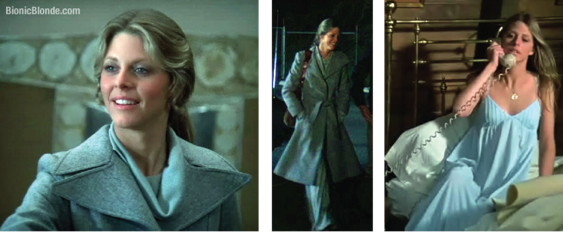 Jaime’s wardrobe department had just 2 outfits and one nightgown for her in this episode. A light blue cowl neck sweater and what looked like matching light blue, wide flare bell-bottom knit slacks, with a grayish-blue wool overcoat. She kept this coat on the whole time for the first couple acts—even when indoors—so unfortunately we never got a look at this full outfit.