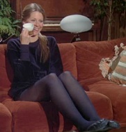 As Oscar was consoling the wife of Rudy’s fishing friend who also got abducted and beamed-up by the UFO, he spots Jaime approaching. She is wearing short velvet purple shorts and a matching top, with purple nylons and slipper style shoes. I gotta say I wasn’t super crazy about this ensemble, but this was the first time I ever recall seeing Jaime wear sunglasses, so I was more focused on the coolness factor there. They were even bejeweled with a little heart in the corner.