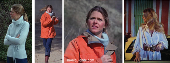 Jaime had 3 outfits for this episode. For the first act she had on a long-sleeved, purple velour pullover top with matching short-shorts, purple nylons, and black ballet slippers. Also, I believe this is the only time we ever see Jaime wearing shades in the series—perhaps necessary to block the neon orange UV of the ugly space craft with which she was forced to co-star.