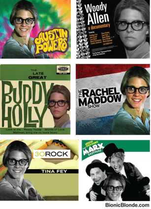 Clearly, Harris is fulfilling a fantasy to conceal Jaime's superwoman abilities by putting her in a classic Clark Kent disguise. (Phone booth sold separately) Well whatever, because on behalf of all her fans here in nerdland who wear glasses, I hereby assign Jaime 500 points for these fabulous fashion frames! (Different from her Harry Potter specs in Over the Hill Spy.) As you can see from the Bionic Blonde research presented on the right, Jaime’s had countless undercover missions over the years where she has successfully fooled us all using this same clever disguise.